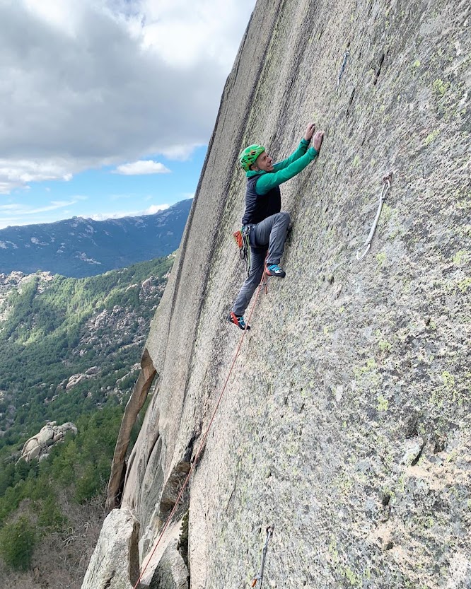 El Loco de las sienes Calientes 7b , la otra joya que recorre el lomo del espolón buscando sus debilidades , escalada de mínimos y equilibrios imposibles